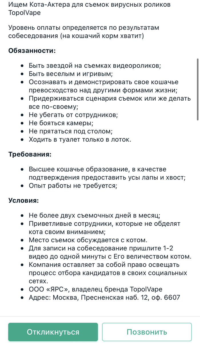 Среди требований уверенная демонстрация кошачьего превосходства и игривость.