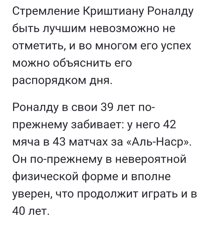 Португальский футболист Криштиану Роналду считается одним из самых узнаваемых спортсменов во всем мире. Фанаты признают его лучшим игроком всех времен. В его карьере было много самых именитых команд Европы. Будучи капитаном своей национальной сборной Роналду в 2016 году стал чемпионом континента. В свои 40 лет футболист находится в отличной форме и продолжает выступать как за сборную Португалии, так и за свой нынешний клуб «Аль-Наср Эр-Рияд» из Саудовской Аравии. Не исключено, что Криштиану выступит на ближайшем чемпионате мира, который пройдет на футбольных аренах США, Мексики и Канады в 2026 году.