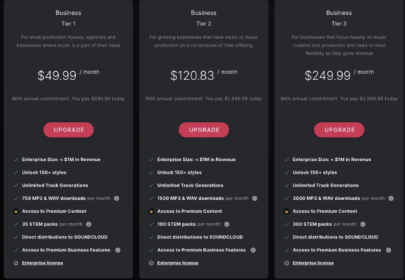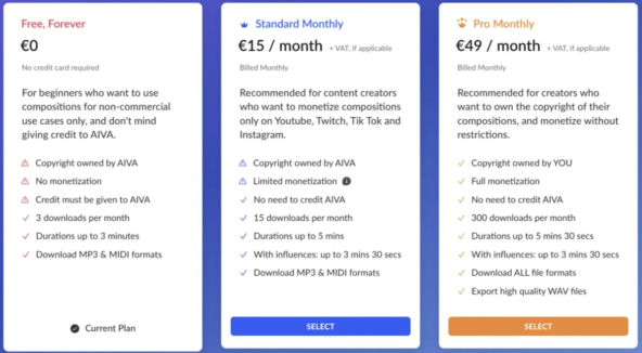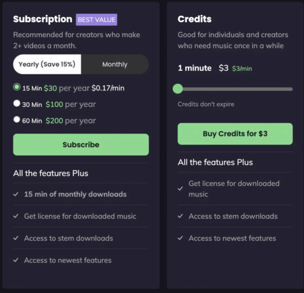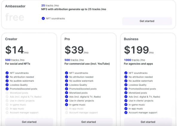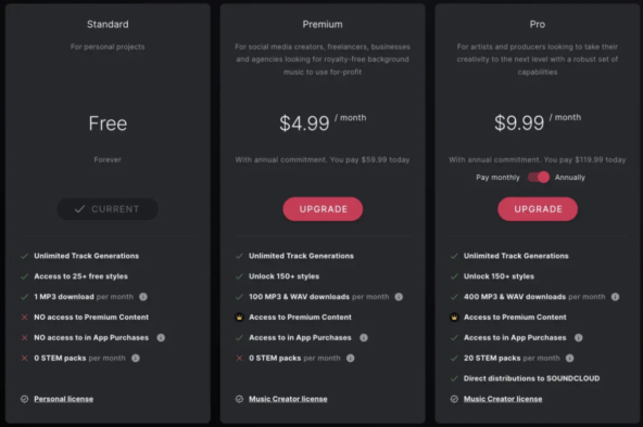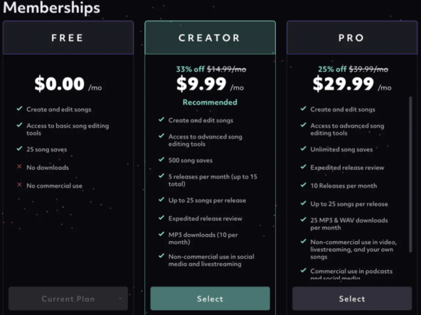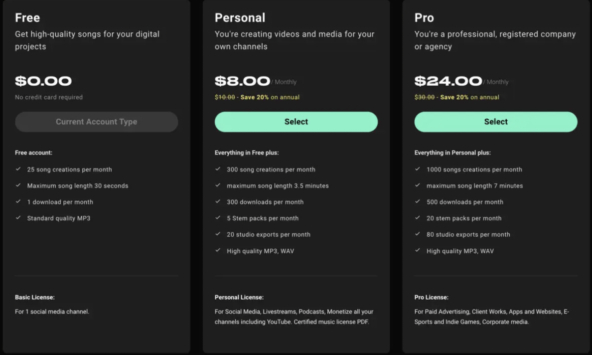 У сервиса есть бесплатный режим с неограниченной генерацией в более чем 25 стилях, но без скачивания. Платные тарифы (от $4,99 в месяц) дают доступ к большему количеству стилей, загрузке треков и их использованию. За $9.99 в месяц добавляется возможность публиковать творчество на SoundCloud.