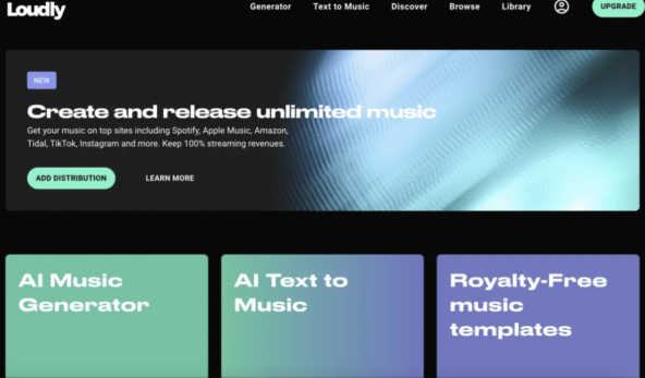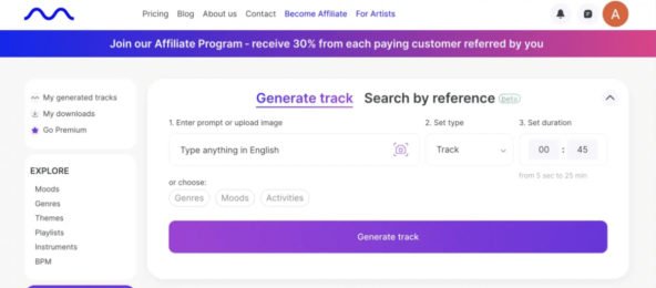 Этот нейрокомпозитор генерирует трек по промпту длиной до 250 знаков. Среди расширенных настроек доступны 15 жанров, продолжительность, музыкальные инструменты, смешение стилей, темп и тональность. Loudly специализируется на электронной музыке, такой как EDM, хип-хоп, техно и лоу-фай.