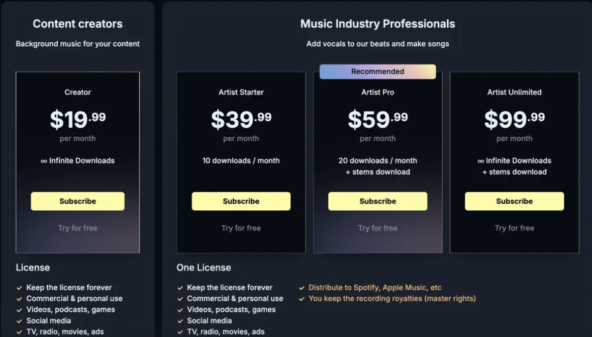 Экспериментировать с генерацией можно бесконечно, но для скачивания и использования музыки нужна платная подписка. Тариф для создателей контента стоит $19,99 в месяц, а пакеты для профессионалов (от $39,99) позволяют дистрибутировать музыку на стримингах и передают авторские права.