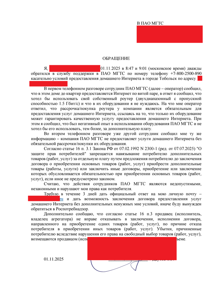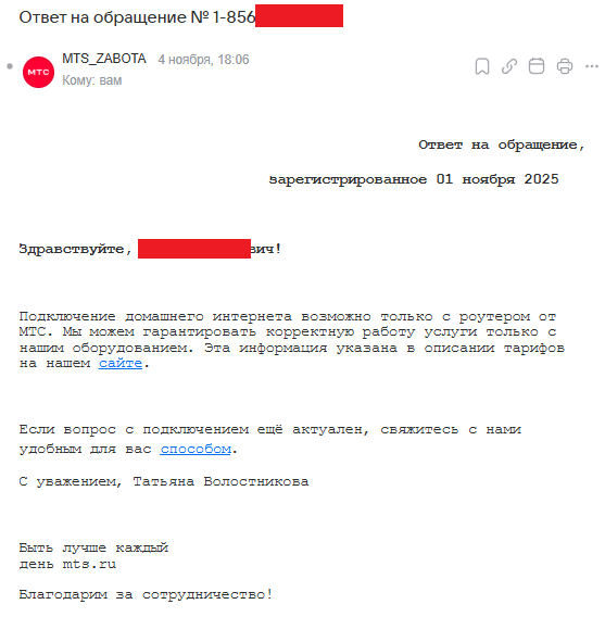 Написал, значит, обращение: да, кривовато, но суть вроде выразил. Немного ошибся адресатом - надо было не в ПАО МГТС, а в ПАО МТС. Было чёткое ощущение почему-то, что Домашний Интернет по всей России предоставляет именно это дочернее предприятие МТС.
