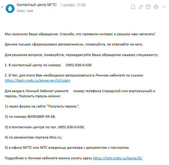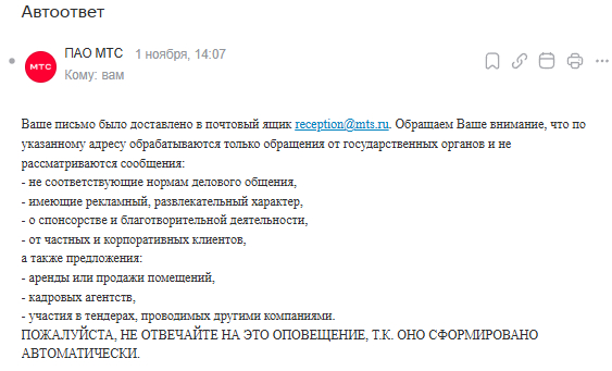 Я обыскал все сайты МТС, МГТС, чтобы понять, куда же электронно направить обращение. Нашел пару электронных адресов. Попытался направить на них (help@mgts.ru, reception@mts.ru). Как оказалось, электронных адресов для обработки обращений не существует (либо их нельзя найти в открытом доступе). Автоответы: ""@Darconos, ты не туда написал", "@Darconos, ты конечно, молодец, но лучше позвони-ка ты в контактный центр либо авторизуйся в личный кабинет".