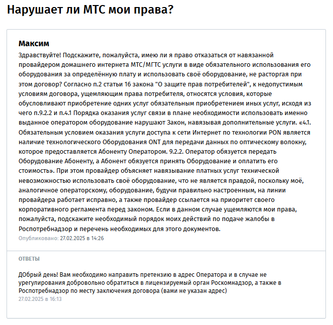 Почувствовал, что что-то не так, решил позвонить в Роспотребнадзор. Там объяснили, что оператор действительно нарушает законодательство по статье 16 п.3 "О защите прав потребителей". Посоветовали направить обращение в адрес МТС, и получить ответ, а после уже обращаться в Роспотребнадзор и Роскомнадзор, описав ситуацию и приложив все возможные доказательства нарушения закона и ущемления моих прав.