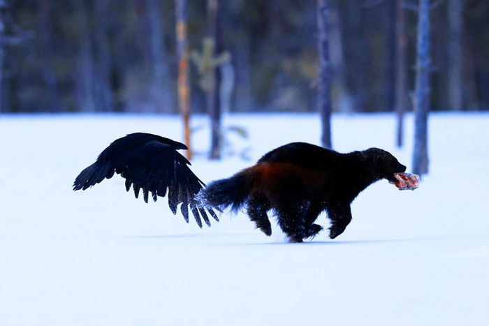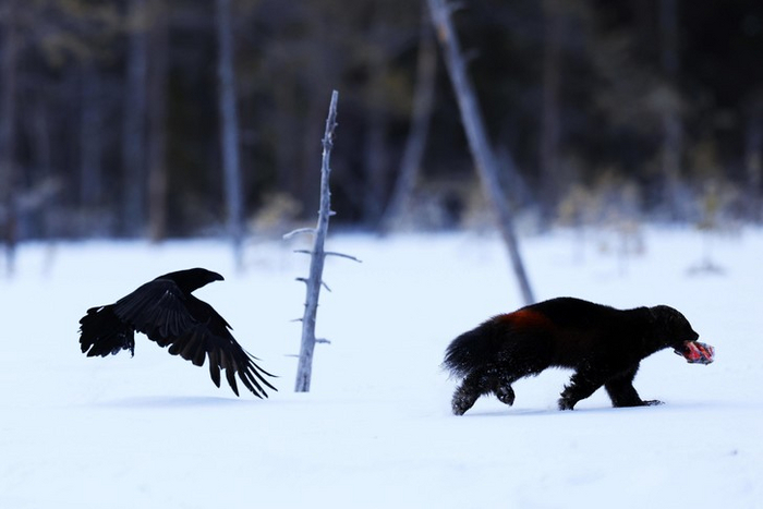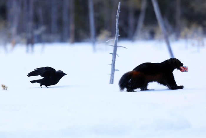 Фотограф Валттери Мулкахаинен во время очередной вылазки на природу запечатлел сцену погони ворона за росомахой: птица пыталась отбить у лесного «пирата» рыбину, которой, по всей видимости, собиралась отобедать.