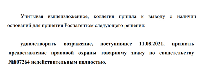 Тем временем в Роспатенте рассматривали возражение. Несколько заседаний коллегия изучала каждое наше доказательство. И вот, в последнем заседании коллегия встает, чтобы озвучить решение…