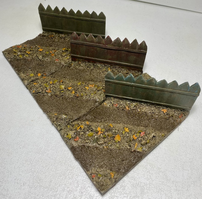 Вначале я вырезаю из листового пластика три заготовки, склеиваю их для формирования ландшафта, на каждую заготовку добавляю забор из деревянного бруса.