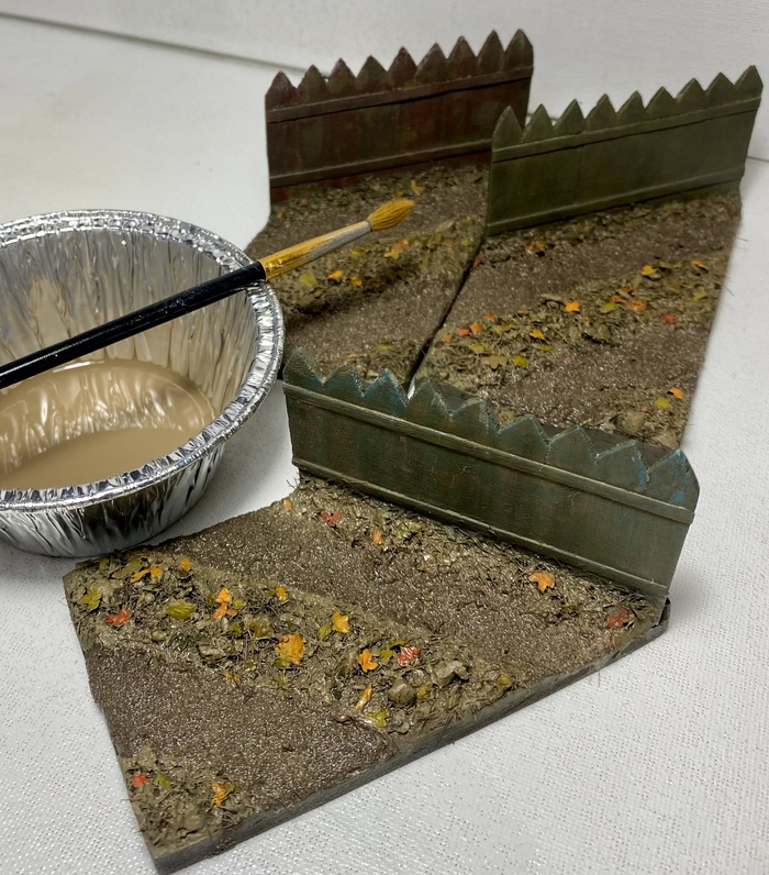 Теперь следует внести цветовое разнообразие. Я возьму три краски Xf-52, xf-49 от Tамии и sandy brown от Mr.Hobby. Хаотично задую ими заготовку. Дополнительно подкрашу заборы в яркие цвета и солью сымитирую на них сколы краски до дерева.