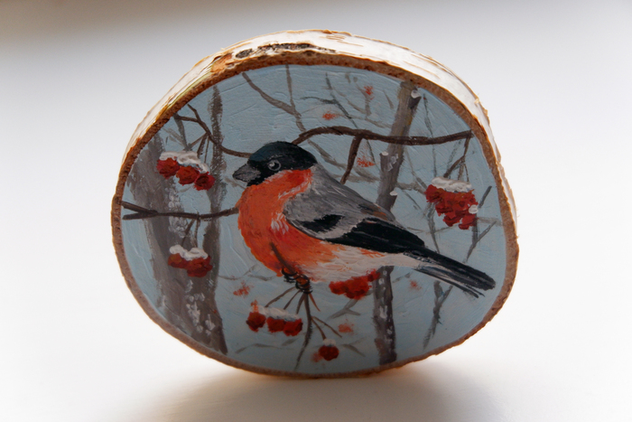 К зиме (и Новому году) у меня почти готова серия из трех работ на дереве. Начинаем с этого пернатого милахи. Несмотря на то что снегири у нас прочно ассоциируются с зимой, они живут в средней полосе России круглогодично, но в теплое время года предпочитают оставаться в густых лесах и лишь с холодами перебираются ближе к людям и остаются в городах примерно до конца марта. Сейчас в нижегородских парках и дворах уже можно изредка услышать их скрипучие голоса, а скоро их будет гораздо больше.