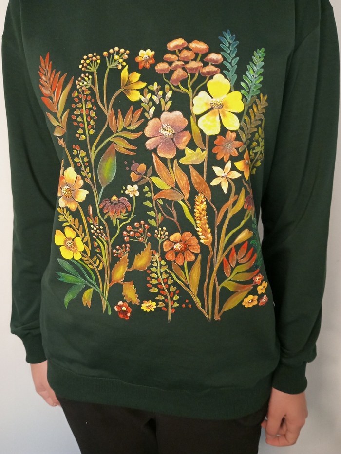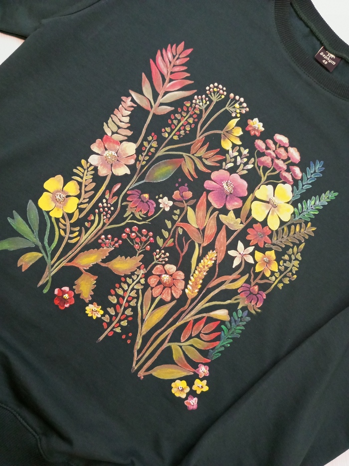 Рисунок выполнен специальными красками по ткани в акварельной технике.Футболка с нежнейшим рисунком, который абсолютно навесом!Это позволяет сделать именно акварельная техника!