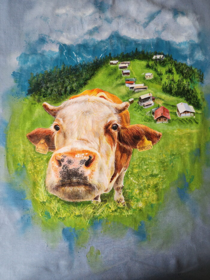 Рисунок на футболке "Любопытная корова" по фото заказчика. На оригинальном фото плато Pokut, Турция.