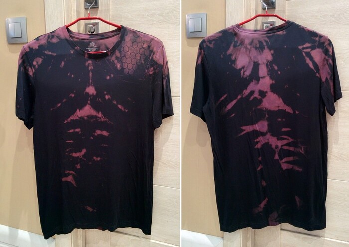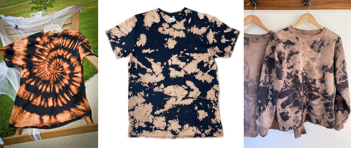 Если же говорить про уроки рисунка отбеливателем, то это будет поиск по “tie-dye bleach”. Картинки из интернета (как я понимаю, отбеливатель на чёрной ткани часто даёт рыжий оттенок):