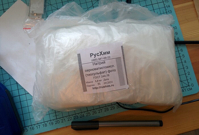 Правда, потом нам нужно нейтрализовать остаток хлора в ткани, чтобы хлор не продолжал свою работу. Некоторые авторы уроков для нейтрализации остатков хлора в ткани предлагают использовать разведённую перекись водорода. Но я решил использовать тиосульфат натрия, потому что это звучит гораздо круче. А ещё эффективнее, на сайтах про бассейны писали, что перекись работает, только если показатель кислотности воды pH больше 7, а тиосульфат натрия работает в любом случае, но стиль всё равно важнее. Тиосульфат натрия можно купить в аптеке или в магазине химических реактивов. Он используется как лекарственный препарат для лечения от глистов, лечения при отравлении мышьяком, цианидами и ртутью, также как закрепитель для фотографии. Но, главное, он не токсичен, как хлор. При взаимодействии с хлором тиосульфат натрия превращается в поваренную соль и сульфит натрия. Сульфит натрия – это пищевая добавка E221, если его не есть ложками и не вдыхать пыль, можно вообще не переживать о токсичности. А при гуглении о тиосульфате натрия я попал на сайты аквариумистов, которые нейтрализуют им хлорамин в водопроводной воде (хлорамин - это соединение хлора и аммиака, используемое для дезинфекции воды). Рыбы вроде от него не дохнут.