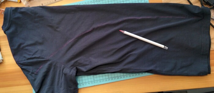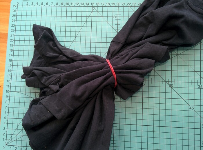 Взял тёмно-серую футболку (цвет был обозначен как «графит»). Чтобы меньше растекалось, взял сухую (в некоторых уроках берут влажную ткань). Схемы складывания проще посмотреть в видеоуроках по поиску “tie-dye bleach”, уроков реально очень много. Я решил опробовать простой вариант, когда футболка сначала складывается вдвое по вертикали, а потом собирается в складки. По замыслу на плечах должна быть более широкая область осветления, так что смываемым маркером по ткани нарисовал примерную линию, а потом складывал так, чтобы линия была посередине.