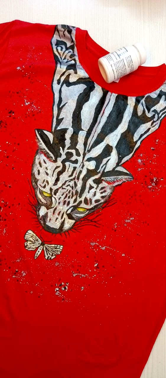 Около пяти лет назад,я работала в студии,которая специализировалась на продаже одежды с ручной росписью. Суть была в том,что заказчики, по большей степени, сами выбирают референсы и эскизы. В основном это картинки из интернета, рисунки их детей или питомцы. Поэтому большая часть моих работ (именно сами росписи, а не эскизы)- это выбор бывших заказчиков. Уникальность таких вещей заключалась не в том,что такой картинки нет в интернете, а в том,что это именно РУЧНАЯ РОСПИСЬ по ткани. Сложный и кропотливый процесс. Многие вносили огромное количество правок,что только добавляло какой-то необычности и эксклюзивности.