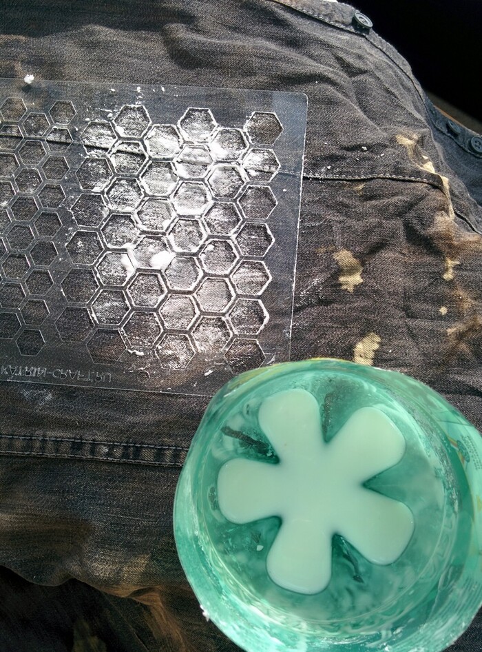 Вылил всё, заново налил воды до первой отметки и отбеливателя до второй. Попробовал на старой ткани. Если лить много, то отбеливает нормально, но вот с трафаретом всё равно растекается. Налить на трафарет немного – не отбелит, налить много – растечётся. Значит, время экспериментов, нужен загуститель. Купил кукурузного крахмала (он немного дешевле картофельного), смешал со своим отбеливающим составом (50/50 вода и отбеливатель) примерно до состояния, похожего на густую сметану (было бы даже «очень похожего», если бы сметана ещё пахла хлоркой). Теперь трафарет нормально промазался, мазал прямо рукой в перчатке и тут же промакивал туалетной бумагой, чтобы вода не растекалась.