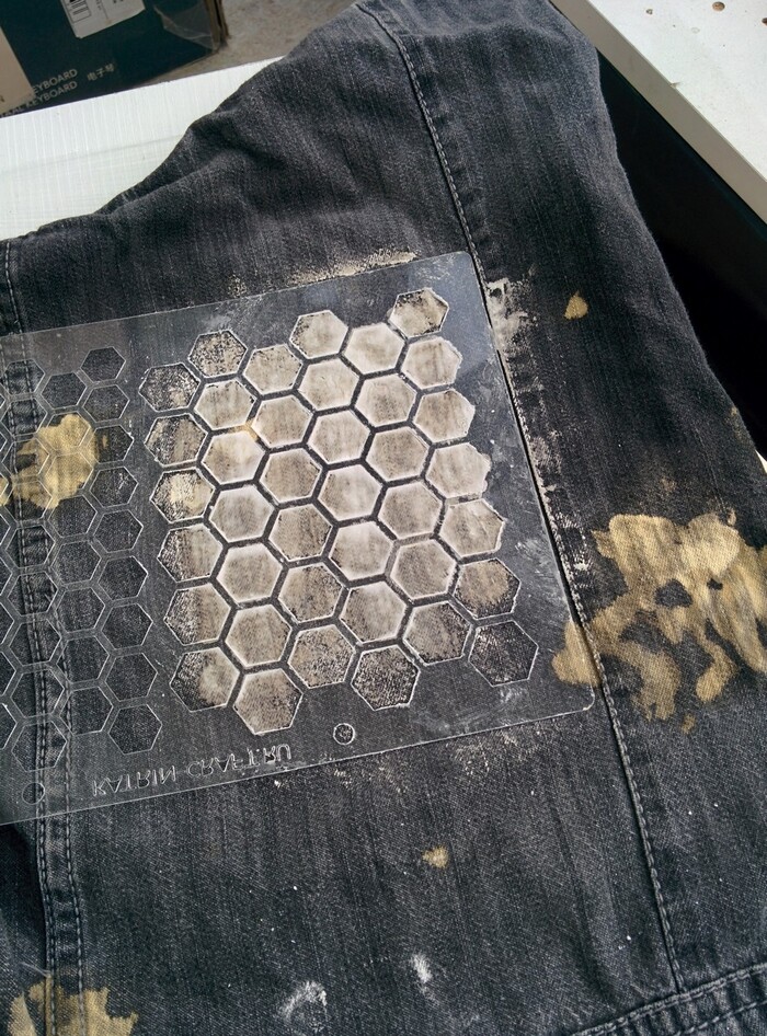 Значит, с крахмалом и трафаретом буду использовать чистый неразбавленный отбеливатель. Тут уже стало заметно. Подозреваю, результат сильно зависит от самого отбеливателя и его концентрации.