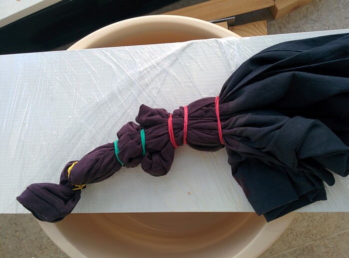 Дальше всё по многочисленным урокам. Стянул резинками, промочил половину из распылителя составом 50/50, посмотрел, как проявляется какой-то бледно-пурпурный оттенок, минут через 20 прополоскал в холодной воде, потом положил в тазик, где развёл примерно пару столовых ложек тиосульфата натрия. Не нашёл информации о необходимой концентрации, но, по идее, после полоскания хлора там осталось немного, должно хватить.
