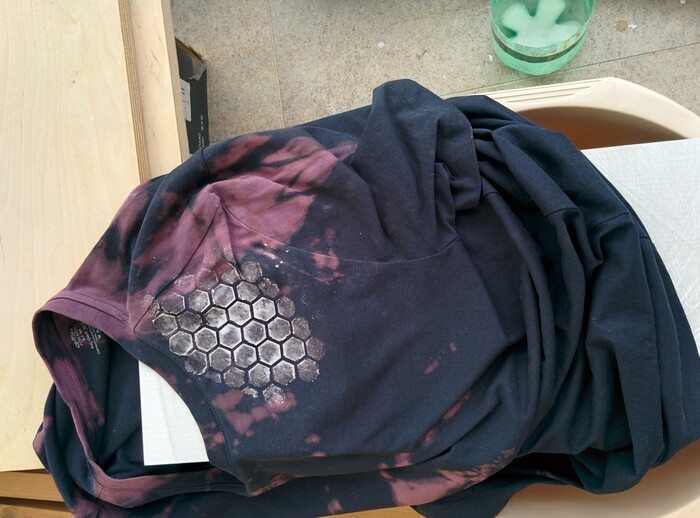 Когда футболка высохла, развёл отбеливатель с крахмалом до густого состояния и ещё поверх промазал по трафарету, промакивакивая избыток жидкости туалетной бумагой. Если через некоторое время не видно действия, можно распылить сверху немного воды.