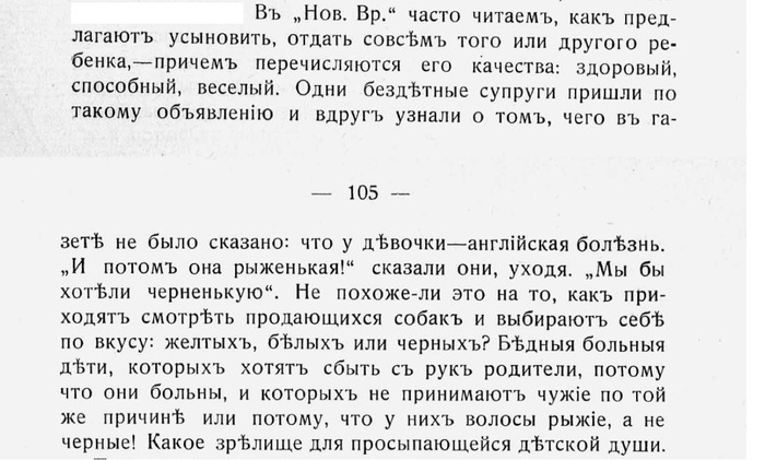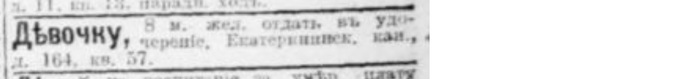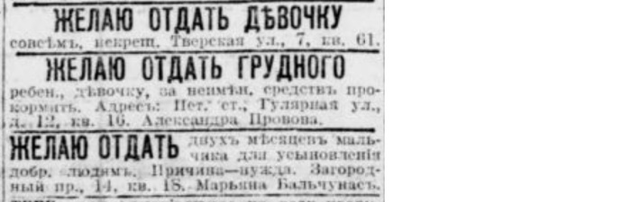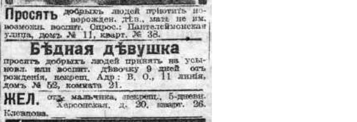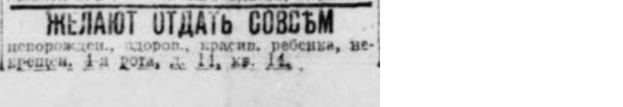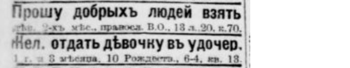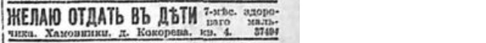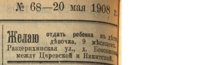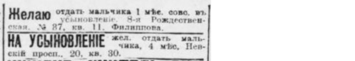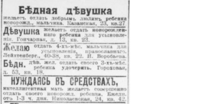 Не откажитесь оказать благодеяние, возьмите на воспитание четырехлетнего, здорового, красивого мальчика. Отец — вдовец, остался без работы и не в состоянии прокормить ребенка. Жена умерла от родов, оставив новорожденную девочку, которую тоже пришлось отдать в чужие руки. Гоголевская ул., рядом с рыбной лавкой Горбунова. Воронежское подворье. Спросить Самохвалова."