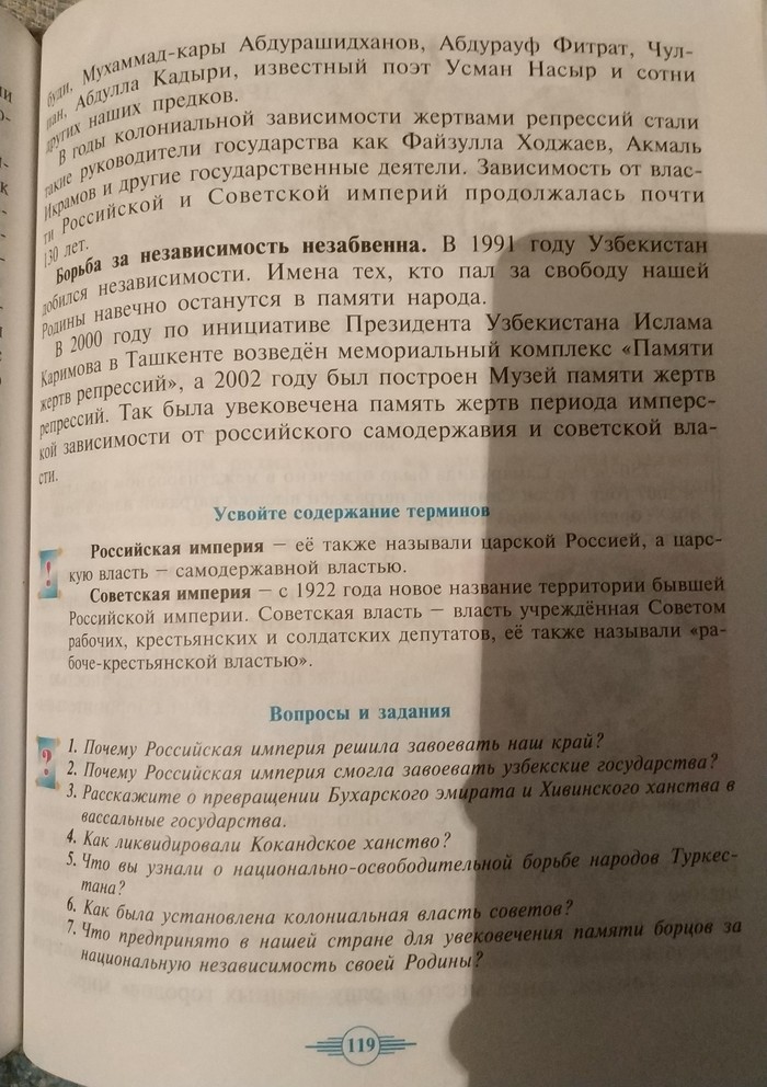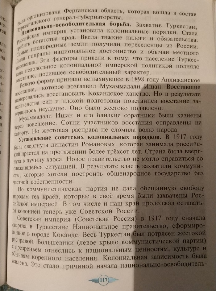Здравствуйте. С вами минутка узбекского образования. Сегодня у нас по истории тема русского колониализма. Итак, узбекские дети в пятом классе проходят по истории главу о том, как русские подло напали на их отечество, воспользовавшись отсталостью военных сил аборигенов. Далее приводятся ничем документально не подкрепленные сведения, больше похожие на пропаганду. Так, в учебнике написано, что русские солдаты с пренебрежением отнеслись к местному культурному наследию (без конкретных примеров) и отобрали у узбеков лучшие плодородные земли. Также пишут о том, что после российской империи узбеки оказались под гнетом советской империи и только спустя многие годы борьбы за независимость Узбекистана, путем множества человеческих жертв, добились независимости Узбекистана от советской империи. Интересно, русских детей во время изучения этого параграфа выводят в коридор или оставляют в классе? И как потом складываются взаимоотношения детей в коллективе?
