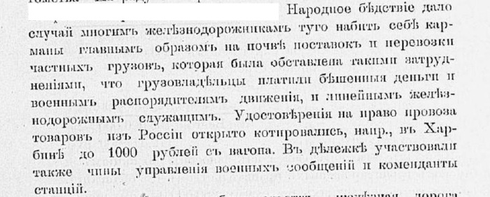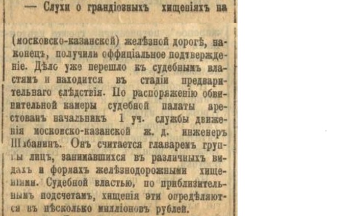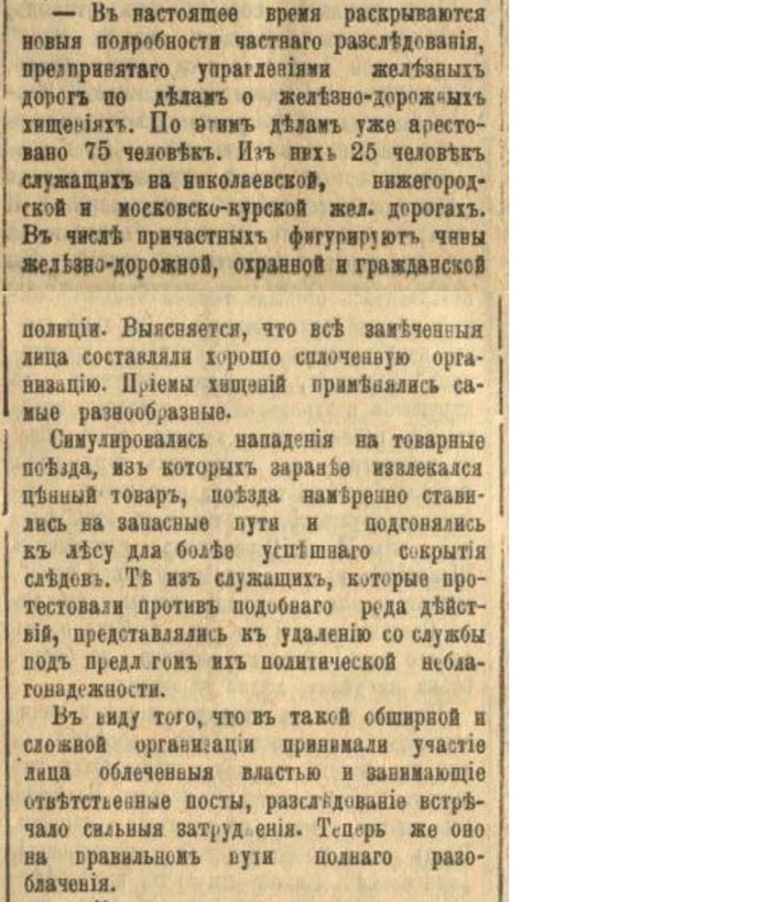 "Хищение товаров на сибирской и забайкальской железных дорогах приняло такой систематический характер, что министерство наряжает из Петербурга в Сибирь специальную комиссию для исследования и изыскания мер к прекращению хищений."