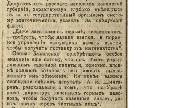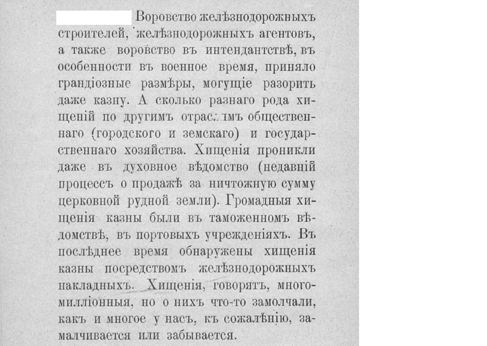 "Одно из последствий "Обновленного строя" — усиливающееся взяточничество. Россия издавна славилась взяточничеством. Но такого повального грабежа, такого беззастенчивого обирания обывателя, как в наши дни, еще не бывало.