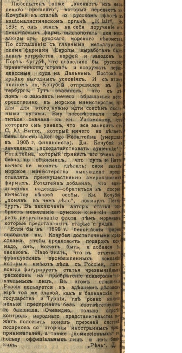 "Потийский городской голова Н.Я.Николадзе, уличенный, как у нас сообщалось, в получении колоссальной взятки в 358000 руб. от строителей потийского порта, письмом в местных газетах объясняет свое поведение так. Он говорит, что действительно получил от строителей порта указанную сумму, но не в виде взятки, а в виде гонорара за "частную работу".
