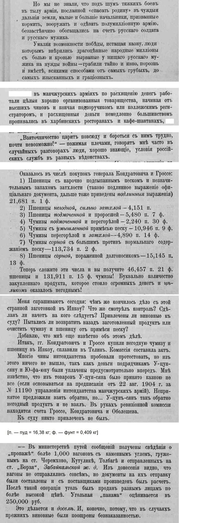 Источник: Ф. Купчинскiй. ""Герои" тыла. (Очерки преступной дѣятельности чиновъ интендантскаго вѣдомства во время Русско-Японской войны)." Типографiя В. Безобразовъ и Ко. СПб., В. О., Большой пр., 61. 1908 г.