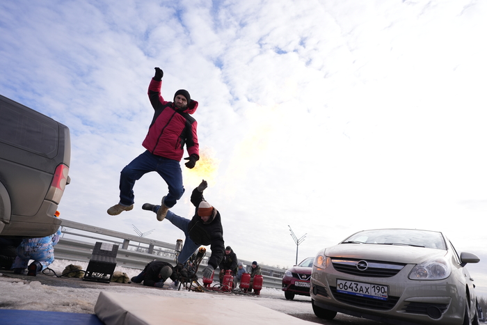 Для Липарита лежали маты, так как он улетал за машину, а мне нужно было падать на дорогу, туда маты не положишь. До обеда нас уже отсняли.