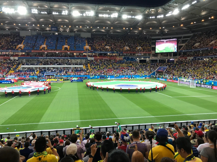 Внутри стадиона все по шаблону, что видели в Ростове по части шоу. Сам дизайн арены уникален и сильно отличается. Мне понравилась задумка сделать трибуны в виде волн.