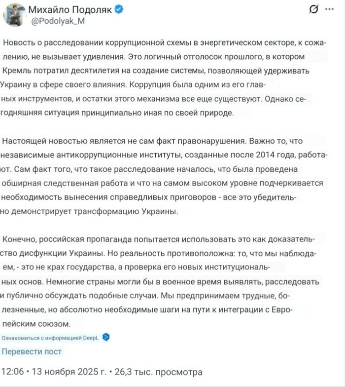 (прим. в этом же издании есть другая «чудная» статья Почему украинцы воюют? Дело о коррупции на 100 миллионов долларов показывает почему Суть опуса сводится к тому, что такой скандал – это хорошо, потому что показывает, что с коррупцией борются и так избавляются от домайданного наследия, потому что на воровство украинских чиновников подсадила Россия, а лично Путин прибрал к рукам Януковича. Про Кучму автор не вспоминает. Зеленский пытался закрыть НАБУ – помешали протесты, гражданское общество есть – тоже хорошо. И до правой руки Зеленского почти добрались, хоть он и сбежал)