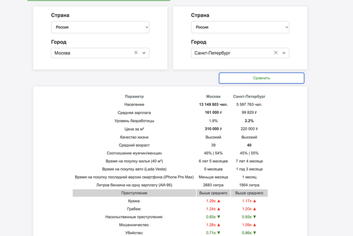 Недавно наткнулся на интересный сервис который позволяет сравнивать два города из разных стран по экономическим показателям, различным преступлениям, и вероятности заболеть той или иной болезнью. Также интересной особенностью является то что можно увидеть какая средняя зарплата и цена квадратного метра в российских рублях не только в городах России, но и в разных городах планеты. Реши я сравнить Москву и Питер. Так вот зп в МСК аж в 1.5 раза выше чем в соседней столице. Это позволяет купить квартиру, машину, смартфон быстрее чем в Питере.