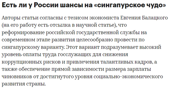 Ученые из институтов РАН и Плехановского университета предложили реформировать в России госслужбу по аналогии с Сингапуром. «Сингапурскому чуду» способствовало финансовое стимулирование чиновников для желания работать на результат.