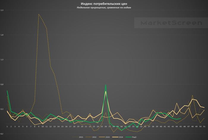 Чуть вышли за целевые недельные рамки. Напомню, они в диапазоне 0,08-0,09%. Но в целом прям нормально. Особенно учитывая время года и предыдущие года.