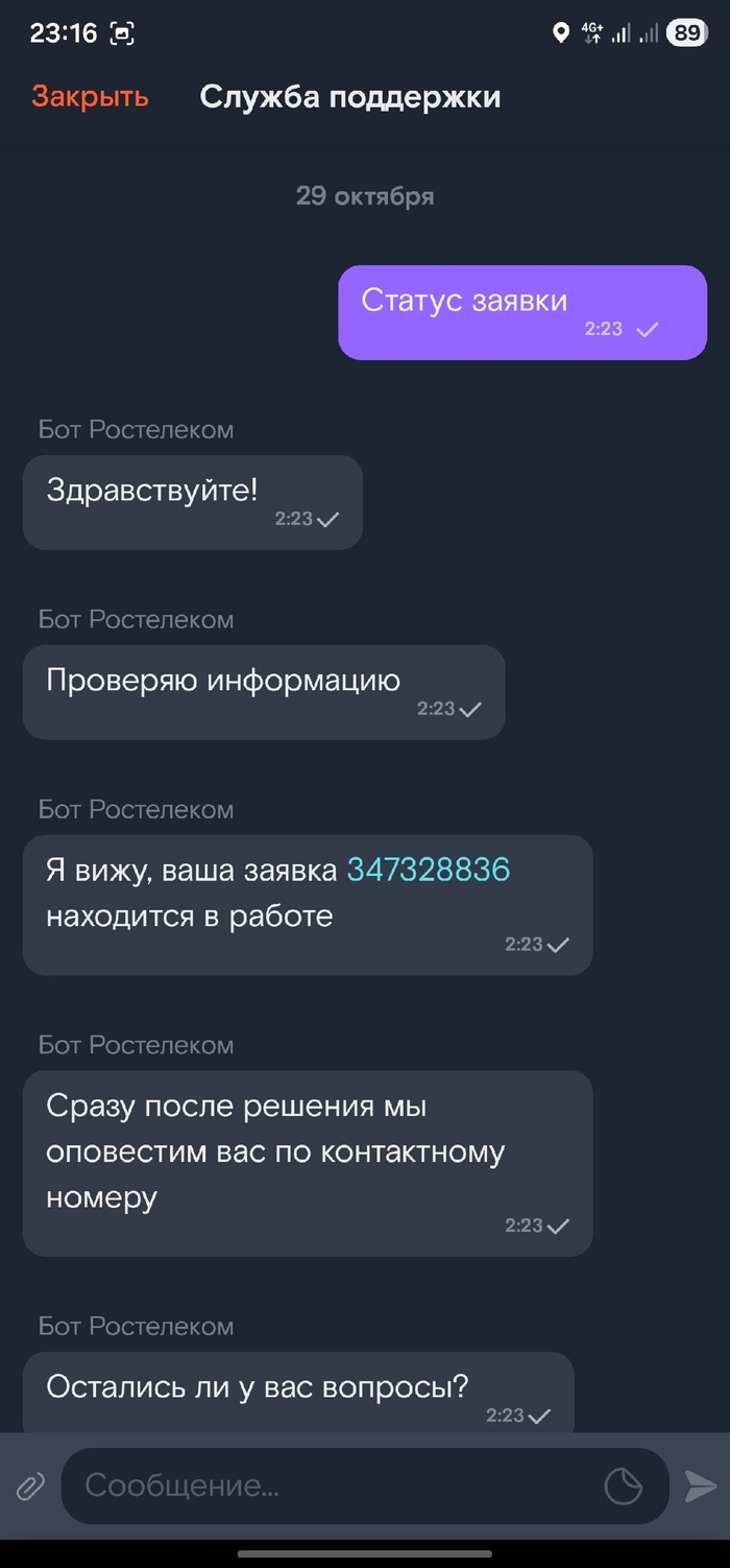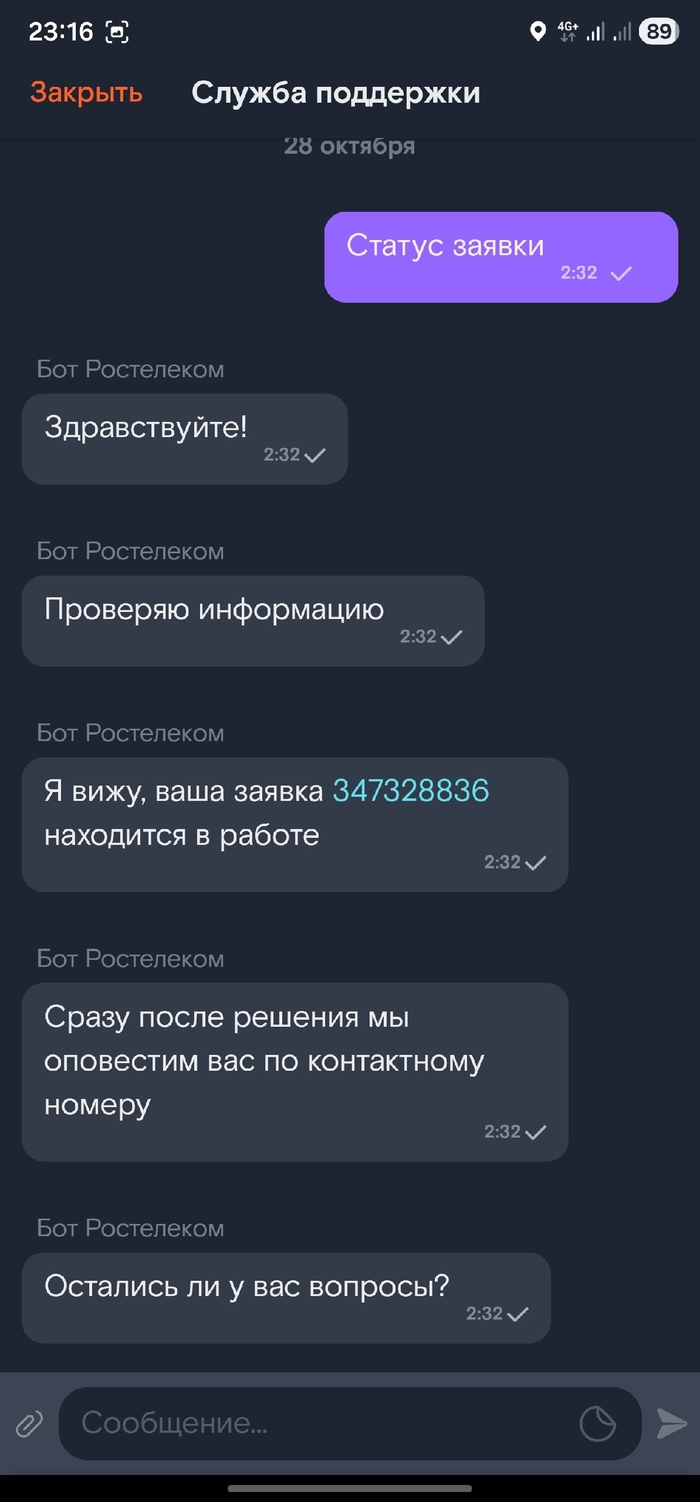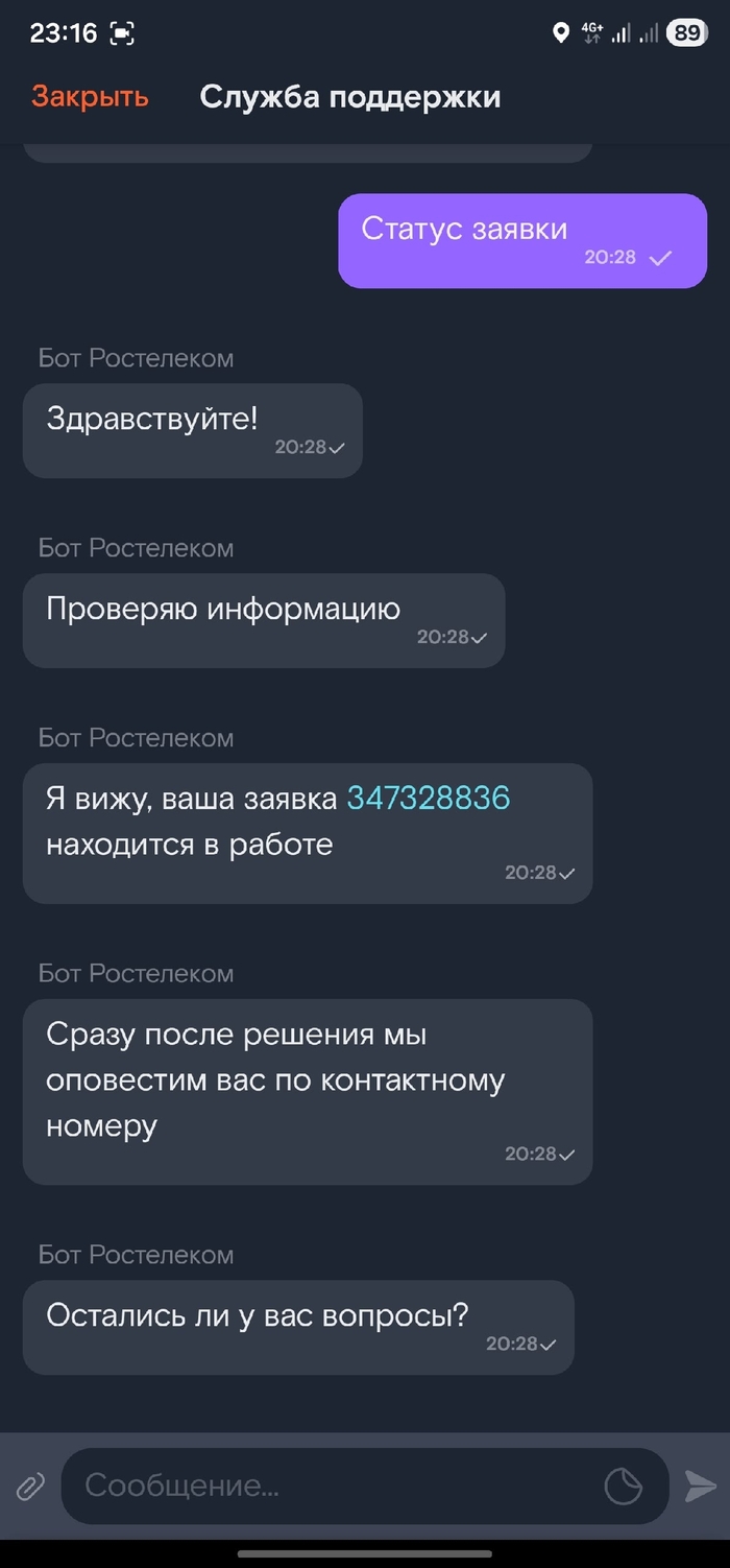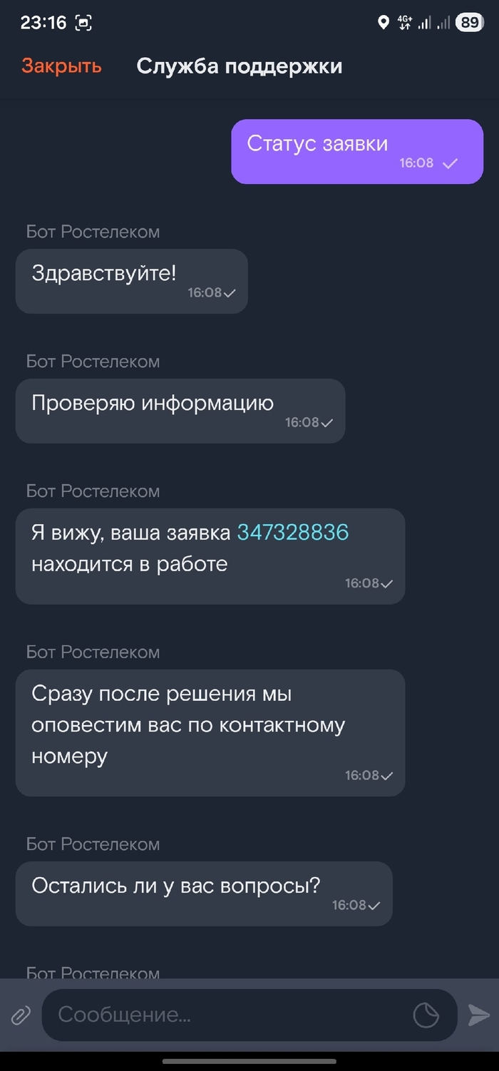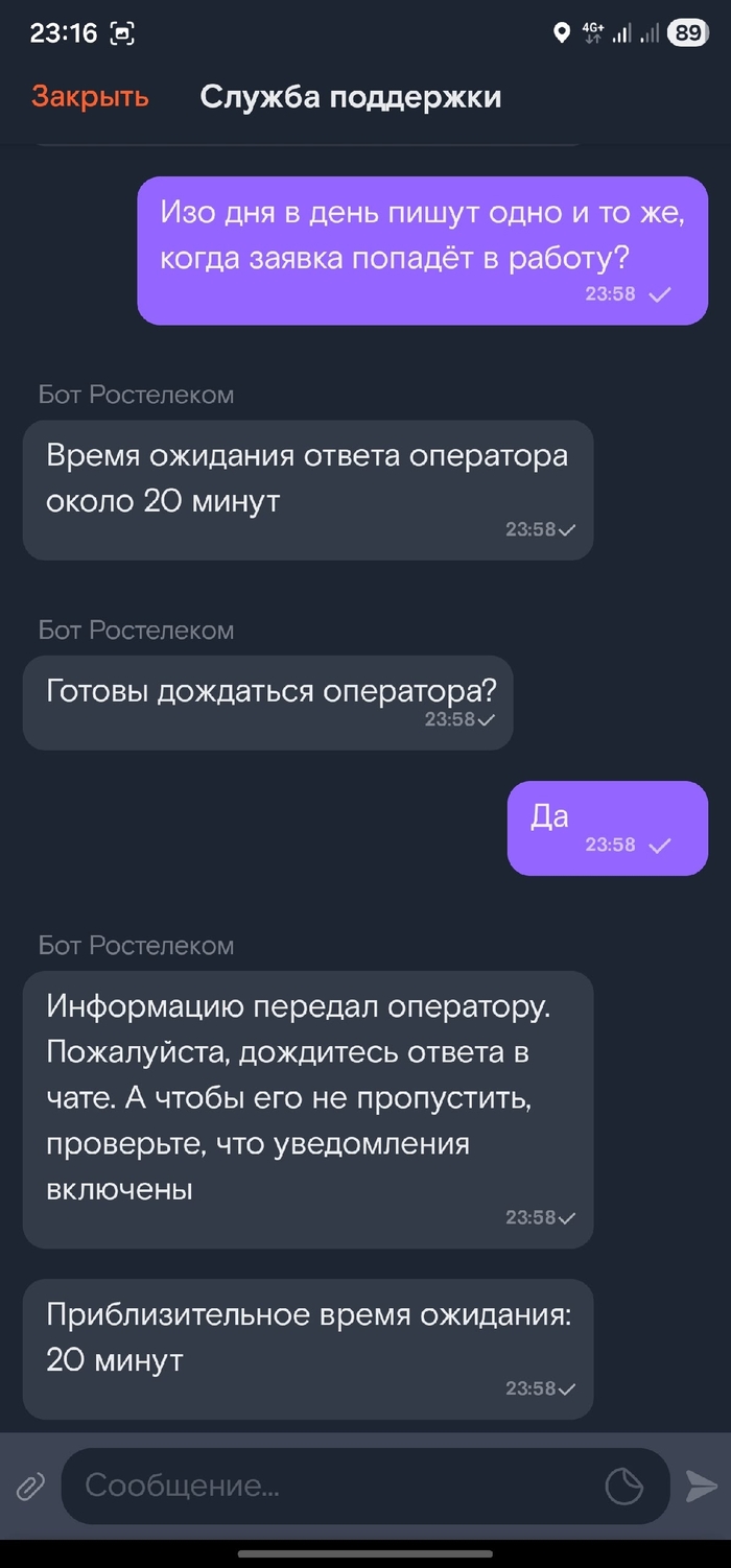 Руководство всего Ростелекома, обратите внимание на то, что всё это недоразумение можно уволить и в чат загнать бота AI. Который не будет позорить честь компании, отвечать будет за 1-2 минуты, будет вежливым и не будет отвечать шаблоном. Кроме того, он может по API выполнять простую диагностику и закрывать базовые вопросы первой линии. Да, у нас такой работает в компании, в которой всего 50 человек в штате. Это делается за 30 минут свободного времени + n8n + интеграция с AI в том же n8n.