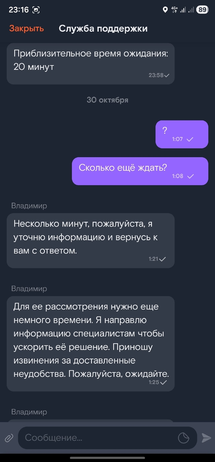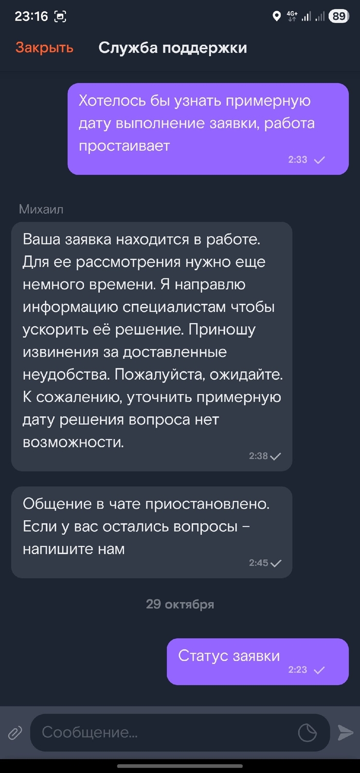 И, собственно, к общению с поддержкой. Мне ответила Дарья. Отвечает шаблонами, игнорирует мой запрос, закрывает заявку.