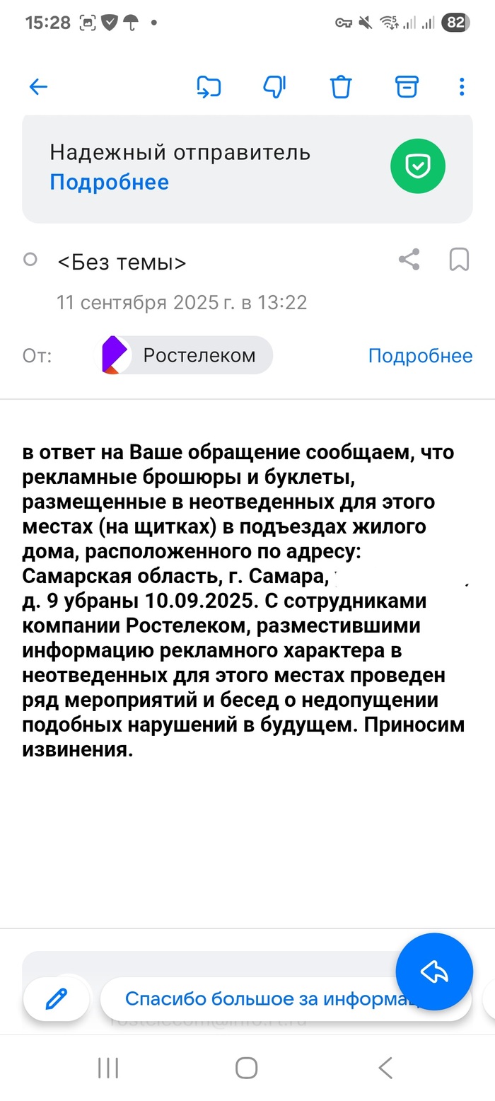 @Rostelekom, вы там совсем уже ухи переели? 25 августа через почту отправил в эту контору гондурасов требование убрать свою сраную рекламу. (Фото 1) Сегодня (11.09.2025) получил письмо, от которого несёт пиздежом. Мои требования те же : убрать рекламу с этих мест. Чтобы понимать - в доме 8 подъездов, 5 этажей. И на каждом этаже висит эта срань! Почитайте санкции по пункту 1, статьи 14.3 КоАП РФ!
