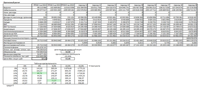 Если выручка компании будет консервативно расти по 2,00% в год, то просуммировав весь предполагаемый доход и разделив на количество акций получим, что 1 обыкновенная акция Ростелеком может стоить 67,13 рублей, что на 1,47% больше рыночной котировки.