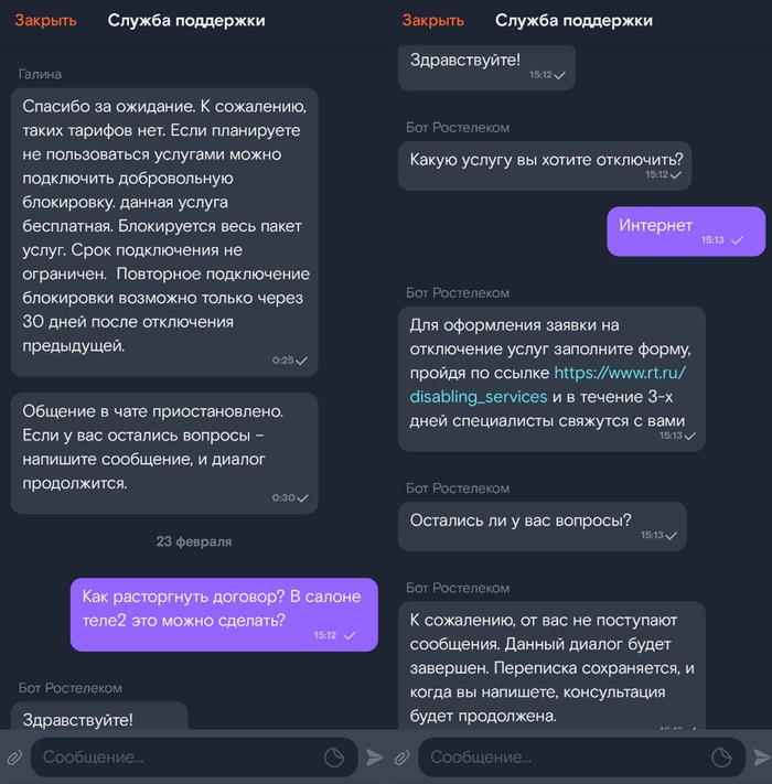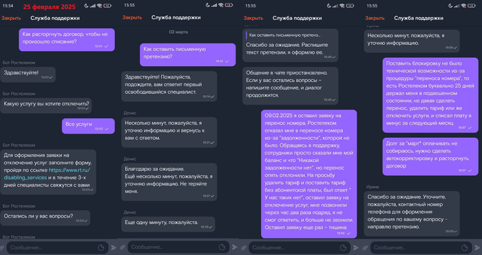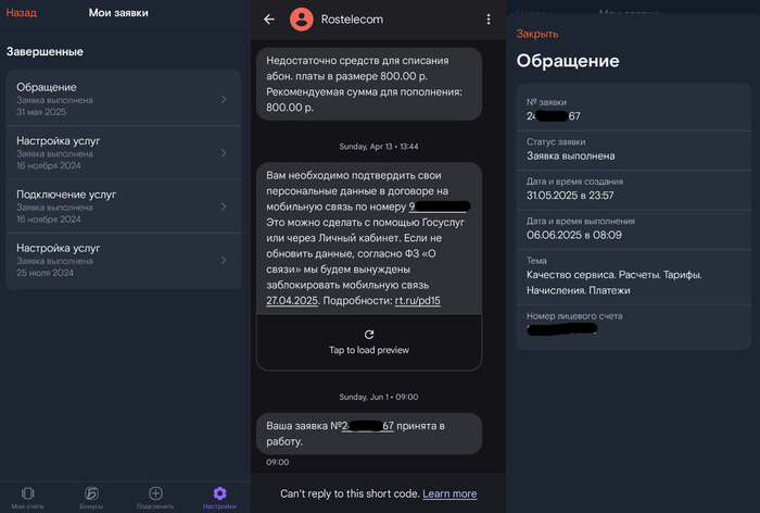 Тем не менее, смс продолжали приходить, я понял, что Ростелеком меня не отпустит. Номер телефона было жаль, но я решил сделать полное расторжение договора и обратился в техническую поддержку. Мне ответили, что НУЖНО ЗАПОЛНИТЬ ФОРМУ, ПОСЛЕ КОТОРОЙ СО МНОЙ СВЯЖУТСЯ В ТЕЧЕНИЕ ТРЁХ ДНЕЙ. Я заполнил эту форму, но прошляпился (мой косяк), потому что Ростелеком позвонил мне три раза с интервалом звонков в 10-15 минут, (я был на работе и пропустил эти звонки). Перезвонив по номеру, мне сказал робот, что по нему могут звонить только сотрудники абонентам с открытыми заявками. Что делать, сам виноват - я заполнил форму заново, включив на телефоне все уведомления. Но больше мне ни этот, ни какой либо другой номер Ростелекома не звонил. Меня то ли внесли в черный список, так как я пропустил их предыдущие три звонка, то ли просто решили не обрабатывать мой запрос на отключение услуг.