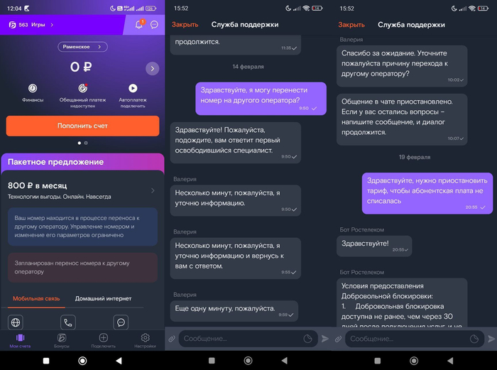 Через 5 дней Ростелеком отказал мне в переносе номера из-за наличия на лицевом счету задолженности. Управлять своим номером в процессе переноса я не мог, о чем также висела плашка в личном кабинете. Я понял, что так может и абонентская плата за следующий месяц списаться, потому попросил поддержку поменять мой текущий тариф на тариф без абонентской платы, и мне ответили что ТАКИХ ТАРИФОВ НЕТ.