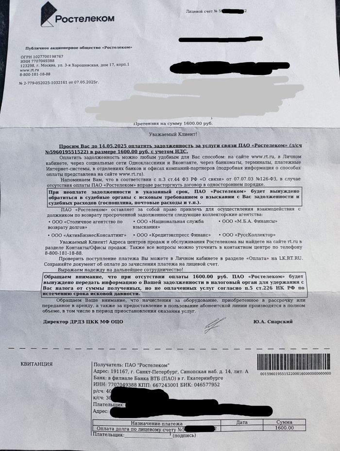 Почему я пишу этот пост? В почтовый ящик мне положили письменную претензию от ПАО Ростелеком на сумму 1600 рублей, согласно которой Ростелеком требует с меня оплаты этой суммы до 14.05.2025 (которая давно прошла, я пытался решить вопрос претензиями, но меня все игнорировали). В случае, если я это не сделаю, Ростелеком будет вынужден обратиться в судебные органы с исковым требованием о взыскании с меня задолженности и дополнительных судебных расходов (гсопошлина, почтовые расходы и т.д.). Также Ростелеком передаст информацию о задолженности в налоговый орган с требованием вычета данной суммы из моей зарплаты.