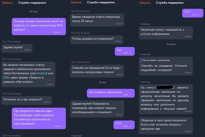 И вот, наступило заветное число нового расчетного месяца, я зашел в личный кабинет и увидел на своём балансе заветное число: -800р, оплатите задолженность. К сожалению, скриншота я не сделал. Я сразу обратился в поддержку, сказав что мне нужно оставить письменную претензию. Я подробно описал всю ситуацию.