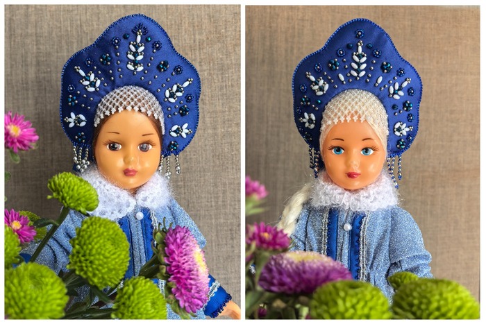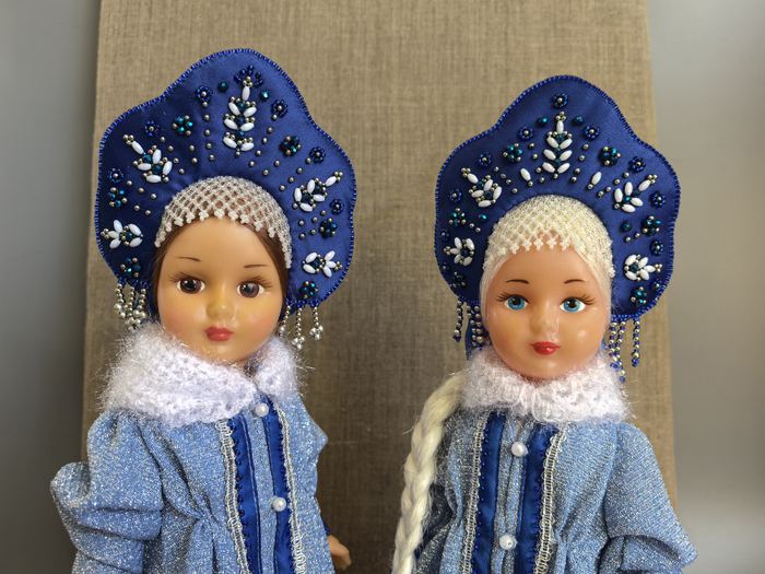 Нарядились. Нижние рубашки из батиста, то-ли-платье-то-ли-шубка – из серебристой парчи, воротнички и муфты связала из пушистой пряжи, кокошники сделала из атласа, расшила бусинами и бисером.