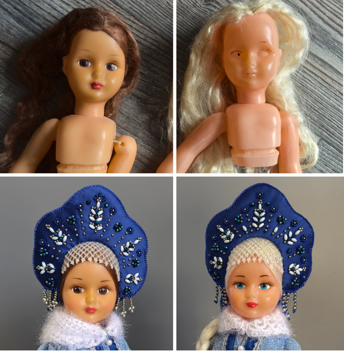 Волосы удалось сохранить только брюнетке, блондинка запросила косу из натурального льна. Ну и лицо новое пришлось рисовать. Юбки-каркасы сшила новые, красивые снаружи и изнутри)
