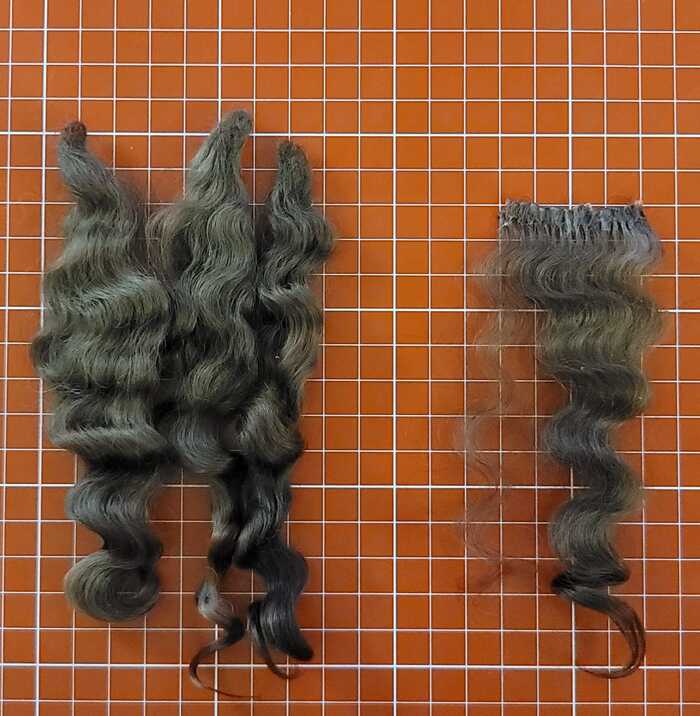 Проклеила и прошила трессы. Слева - вымытая, окрашенная, собранная в пучки и завитая шерсть (покупала уже готовую), справа - клеевой тресс ещё без прошивки (клей "Момент Кристалл" не аутентичен, но здорово облегчает жизнь):