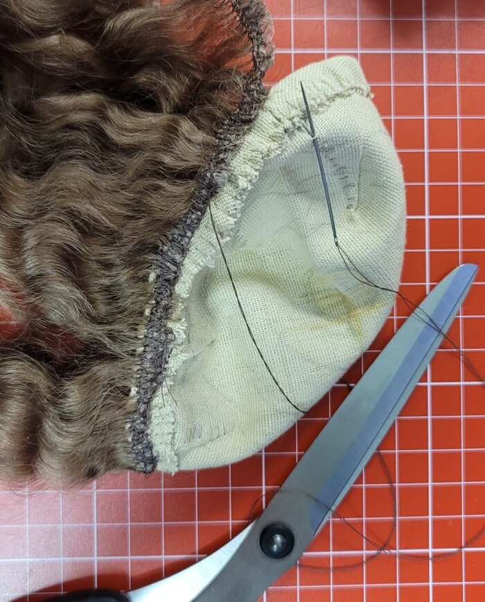 Изнанка парика. Видно ряды, пробор и место прошивки макушки:
