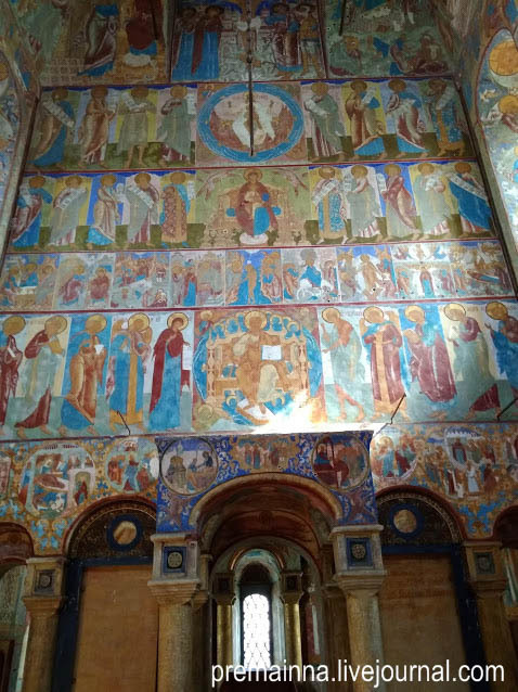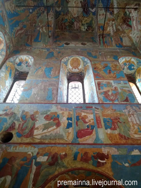Побывала я как-то, ещё до пандемии, в Ростовском кремле, очаровалась уникальными композициями церковных фресок и белокаменных святыней. От экскурсоводов я узнала, что эти шедевры создавали в 1670-1680-ые годы мастера-иконописцы костромской и ярославской школ. Росписи стен храмов, к счастью, с годами стирались. Но в 1950-ые гг. их начали реставрировать. Храмы митрополичьей резиденции Ростовского кремля - ныне часть музея-заповедника.