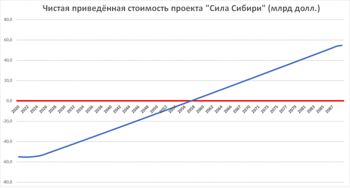 Что же мы видим? Если перенести полученные значения на график, то мы увидим, что через нулевую отметку показатель чистой приведённой стоимости пересечёт лишь в 2058 году. Т.е. окупаемость «Силы Сибири» наступит только на 40-й год реализации проекта. И это в том случае, если условия будут складываться благоприятно. Например, Китай не откажется от закупок газа, как он это уже делал с США, а цена на газ не обвалится вслед за очередным кризисом.