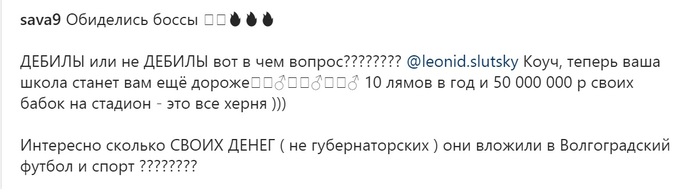 – Потому что я волгоградец, потому что я люблю этот город. И из-за каких-то мудаков, которые не позволяют развивать футбол, я не собираюсь поднимать руки.